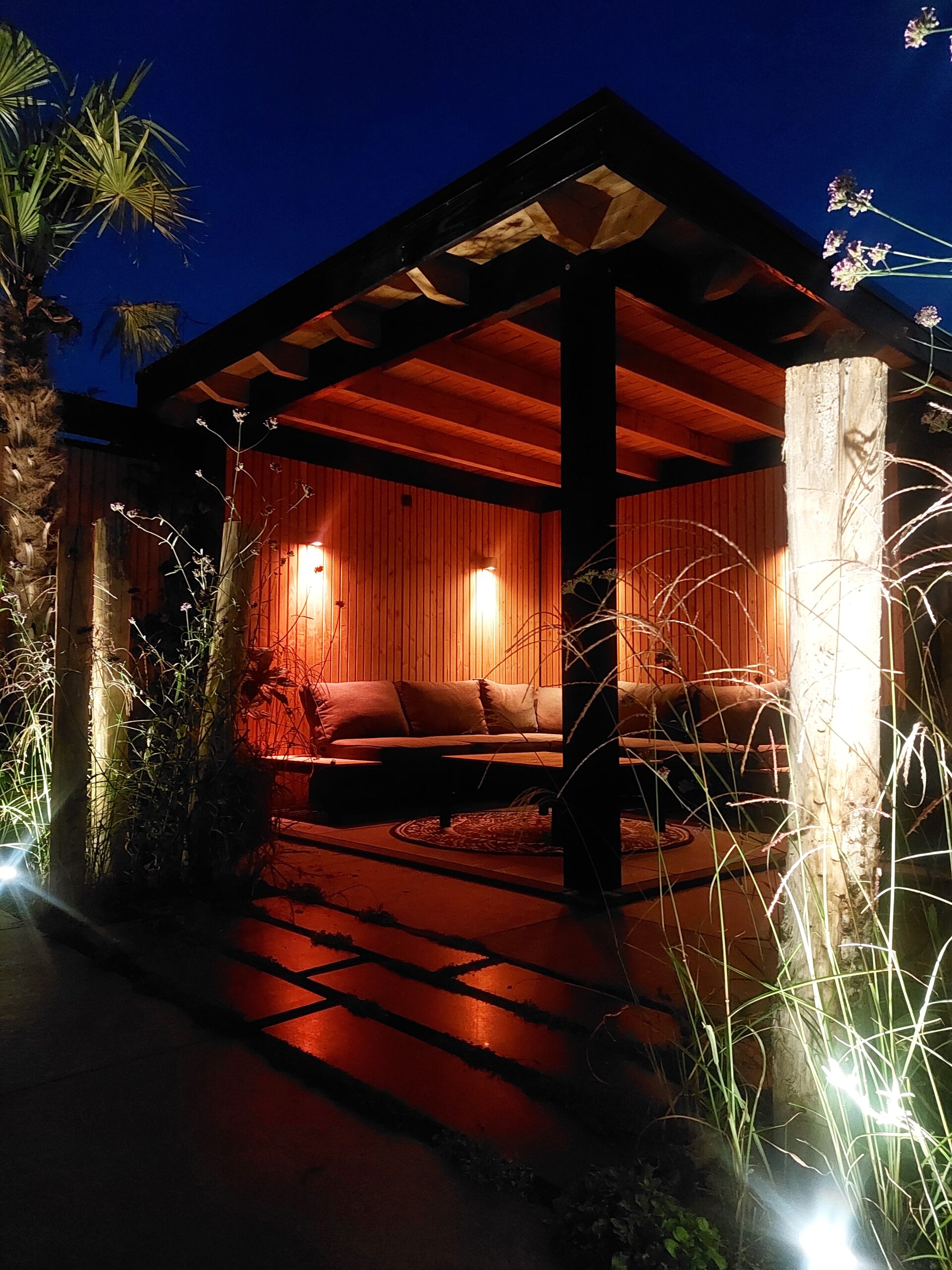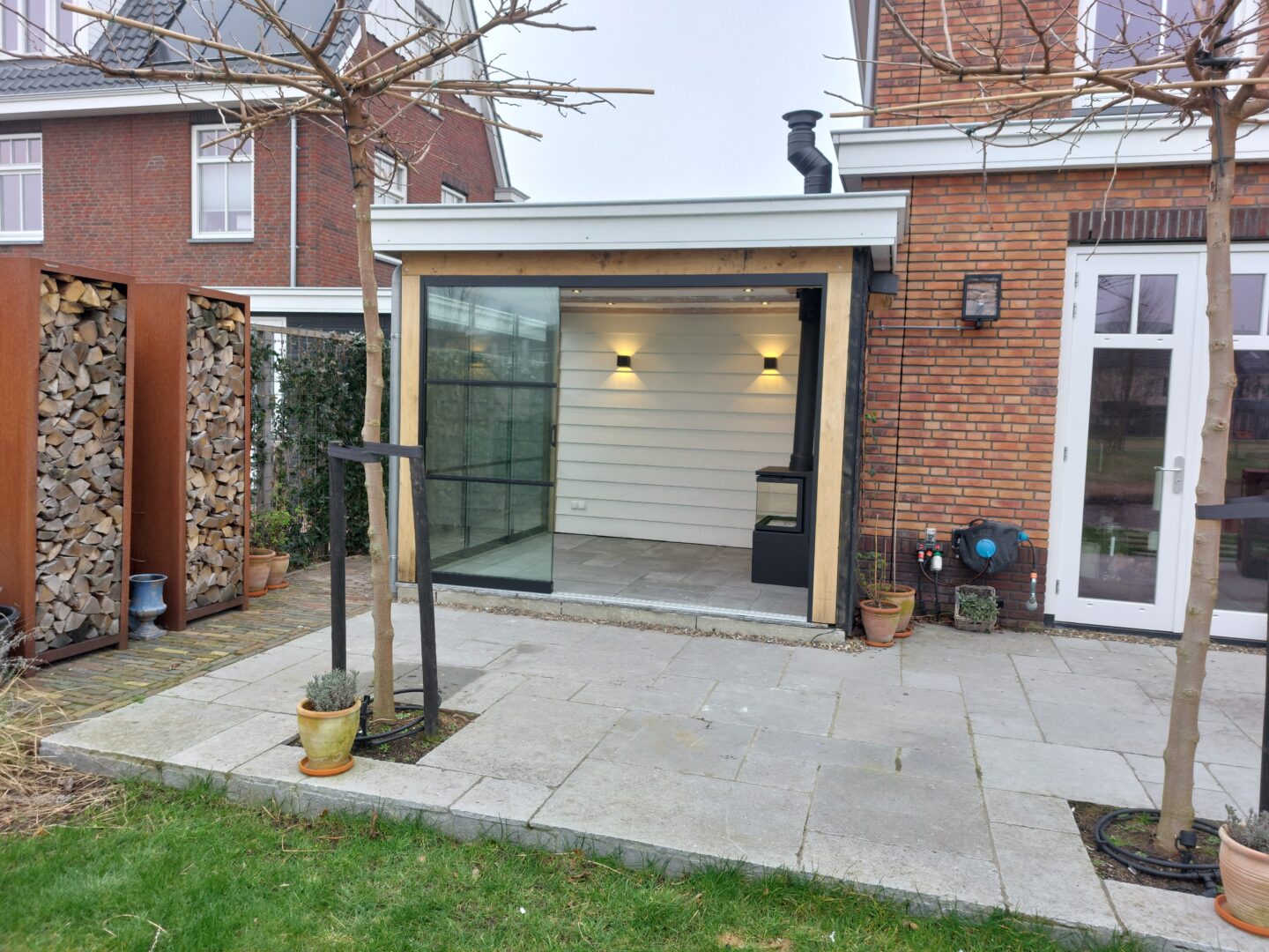Ja, wij verzorgen de complete elektra-installatie inclusief wandcontactdozen en tuinverlichting, netjes weggewerkt voor een strak resultaat.