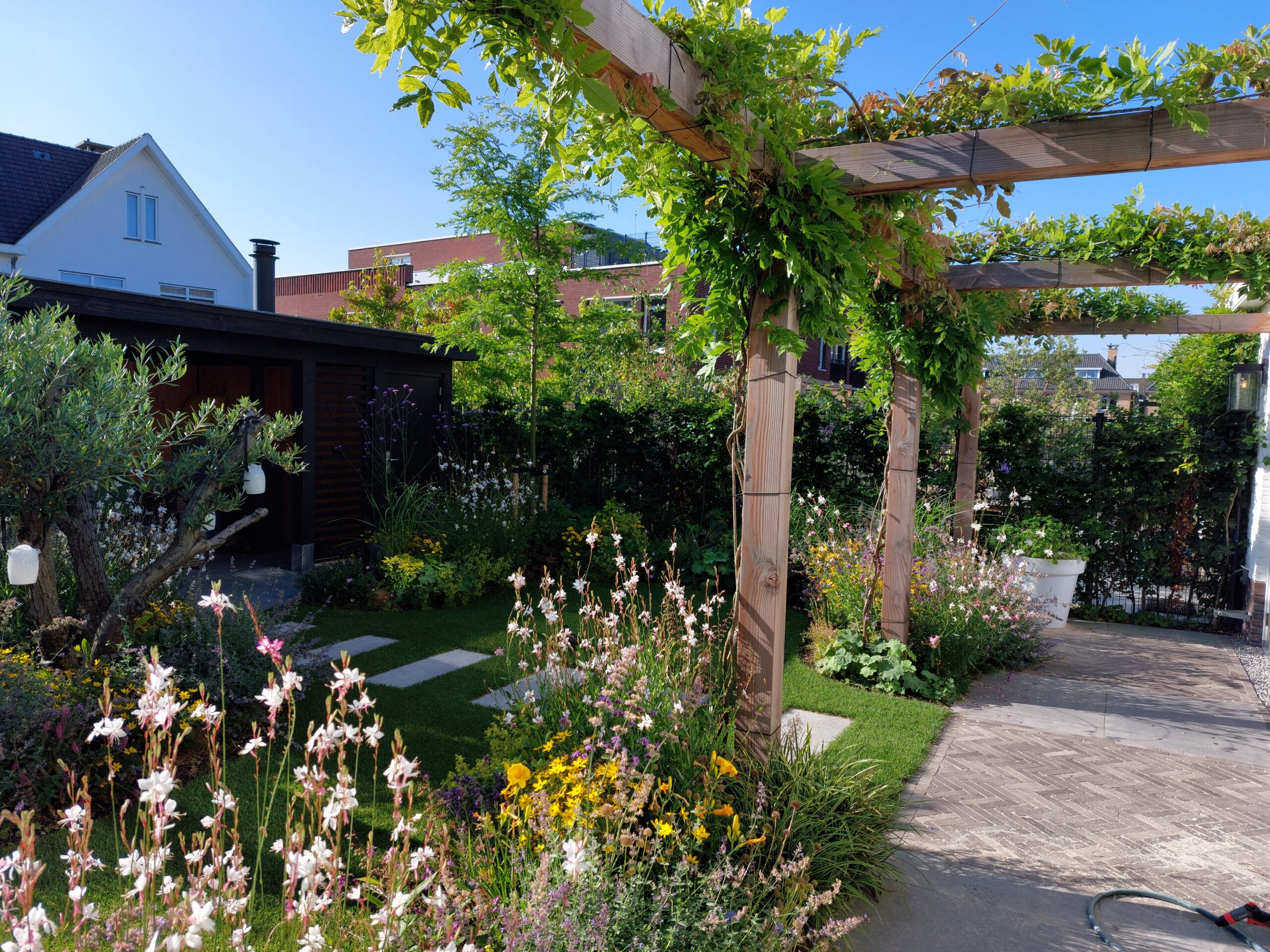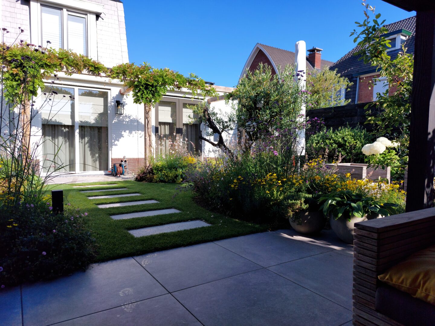 Voor deze klant in Katwijk aan Zee hebben we een tuin ontworpen waarin comfort en gebruiksgemak centraal staan. De wens was een tuin die het zeeleven en de woning mooi aanvult, met voldoende zitplekken, een royaal terras en onderhoudsvriendelijke beplanting. We kozen voor heldere lijnen, keramische tegels en een uitnodigende pergola om het buitenleven te accentueren.