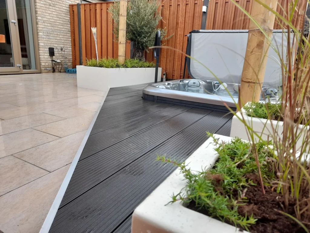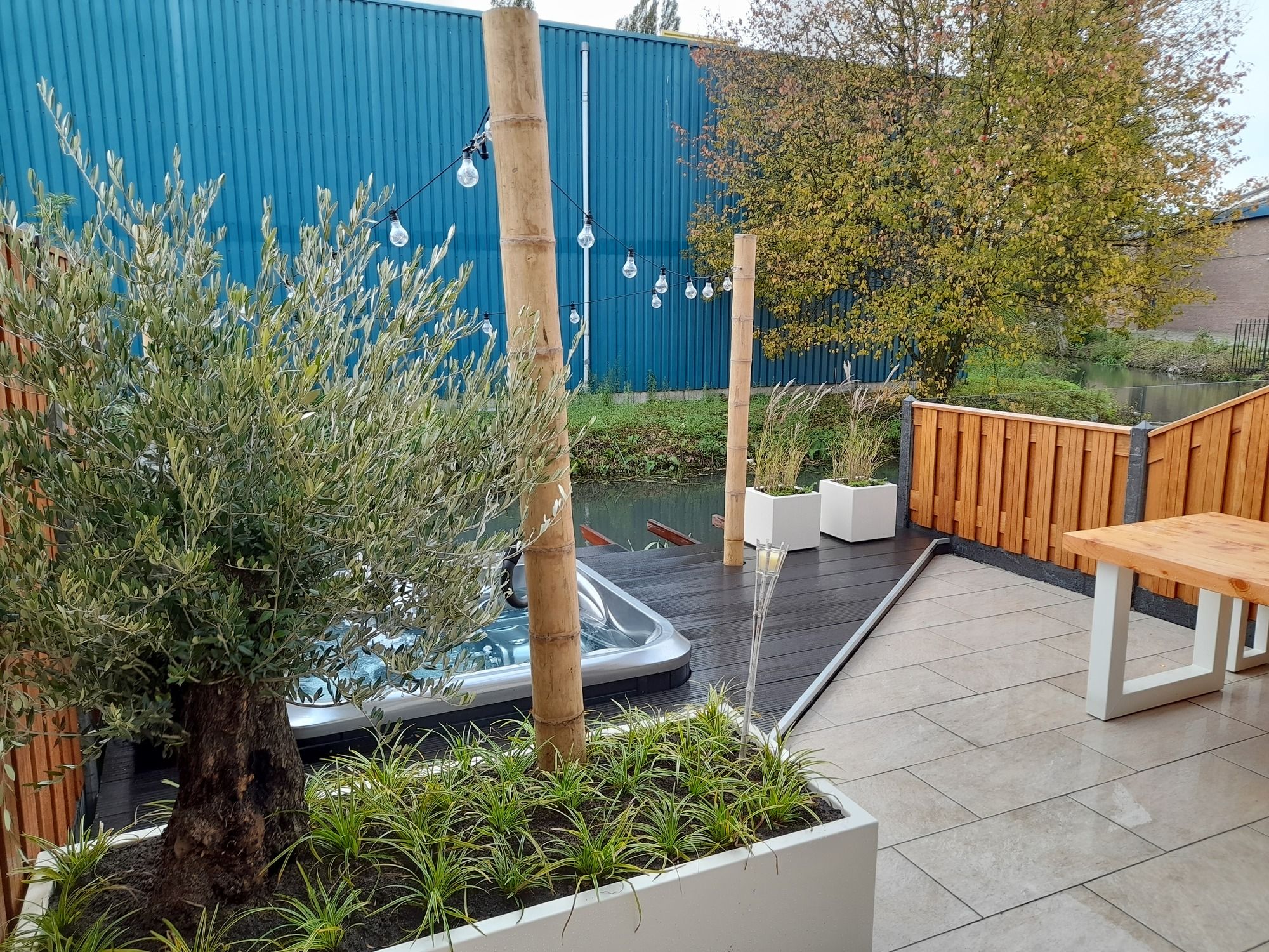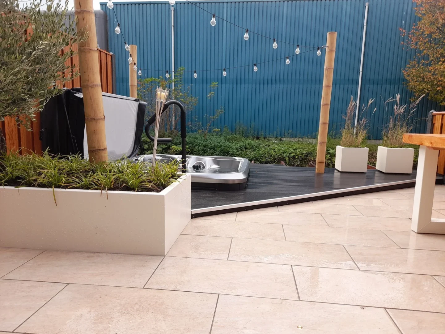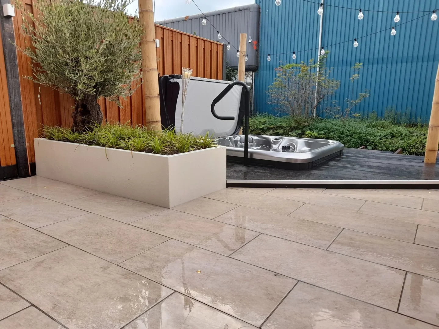 In Leiden realiseerden we een moderne stadstuin met strakke lijnen, keramische tegels en een onderhoudsvriendelijke beplanting. De combinatie van open terrassen, een jacuzzi en groene accenten zorgt voor een praktische en sfeervolle buitenruimte waar de bewoners het hele jaar door van kunnen genieten.